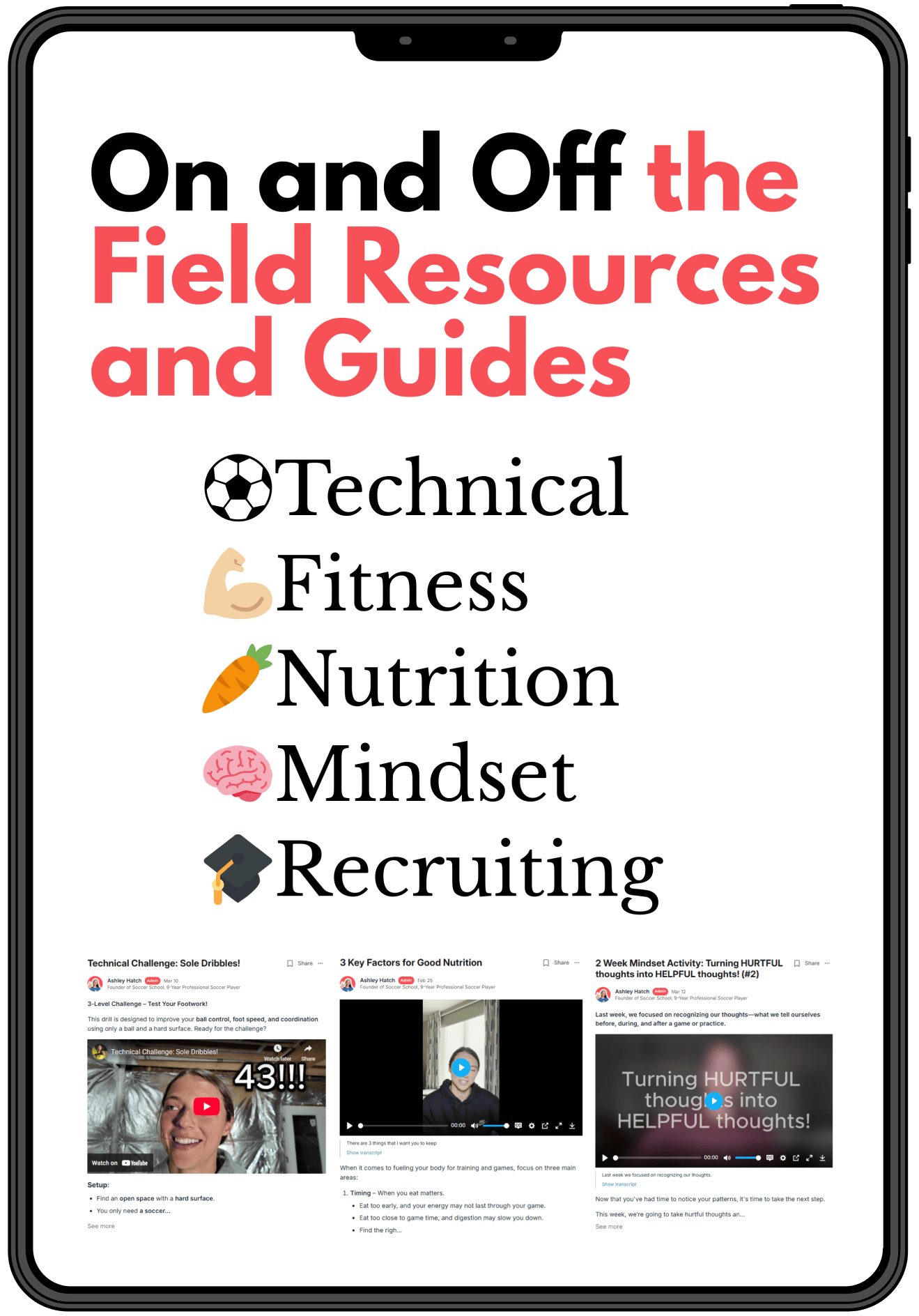 With Soccer School...not only are you getting unrestricted access to pro soccer player Ashley Hatch and her expert network, you are also getting access to a invaluable on and off the field resources, plus a community of like-minded parents and athletes all wanting the same thing: clarity and success in their journey through youth soccer. Soccer School is here to supplement, as little or as much as you like, your efforts to help your child succeed.